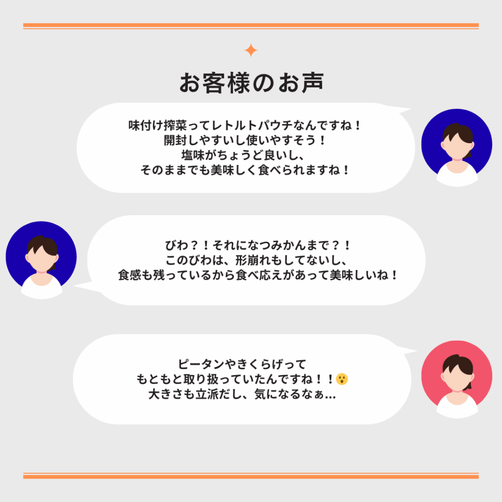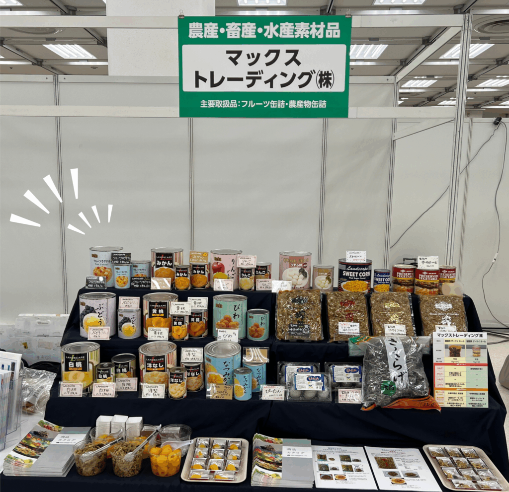 今回の展示会では、定番のフルーツ缶詰に加えて、新商品の「味付け搾菜ストリップ」の